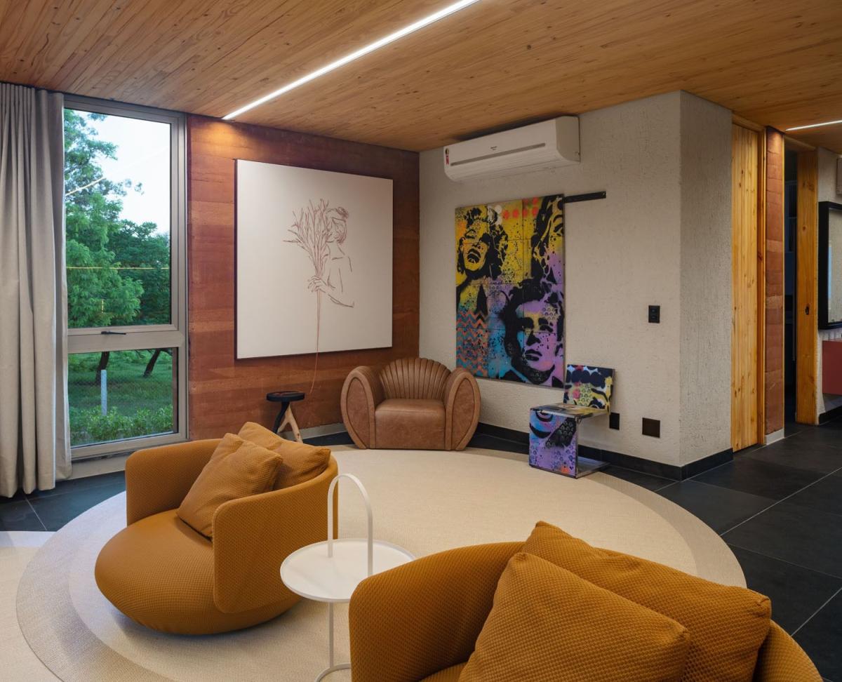 As 6 suítes, 4 delas em um bloco separado para mais privacidade, são conectadas por uma marquise, um píer de deck pinus tratado, que leva e conecta todos os blocos. As duas suítes Masters (120 mts²), em um segundo bloco, são bem espaçosas e possuem varandas. Toda marcenaria da casa foi concebida em lâmina de madeira freijó natural, e o forro de toda casa foi feito customizado em pinus.