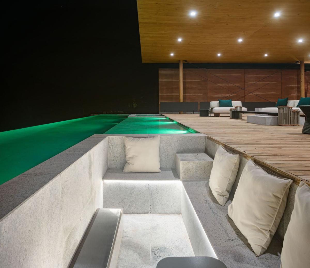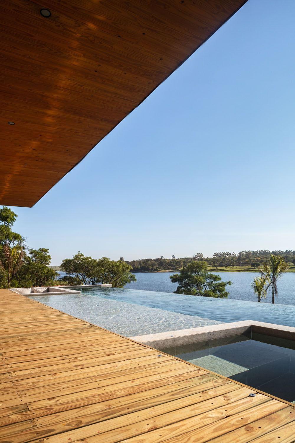 Uma combinação que faz com que seja a única casa nesse molde no mundo! Todos materiais usados na casa são naturais, desde a Ardósia preta exportação do piso, até as bancadas em granito levigado, mesmo material usado na piscina, que a tarde faz com que a água da piscina se conecte com a água da represa.